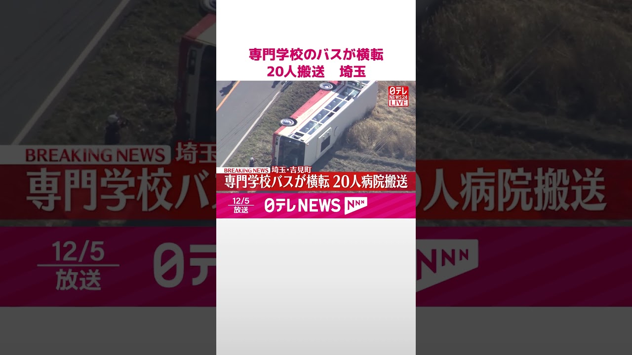 5日午前、埼玉県吉見町で専門学校のスクールバスが横転し、20人がけがをしました。いずれも軽傷だということです。
