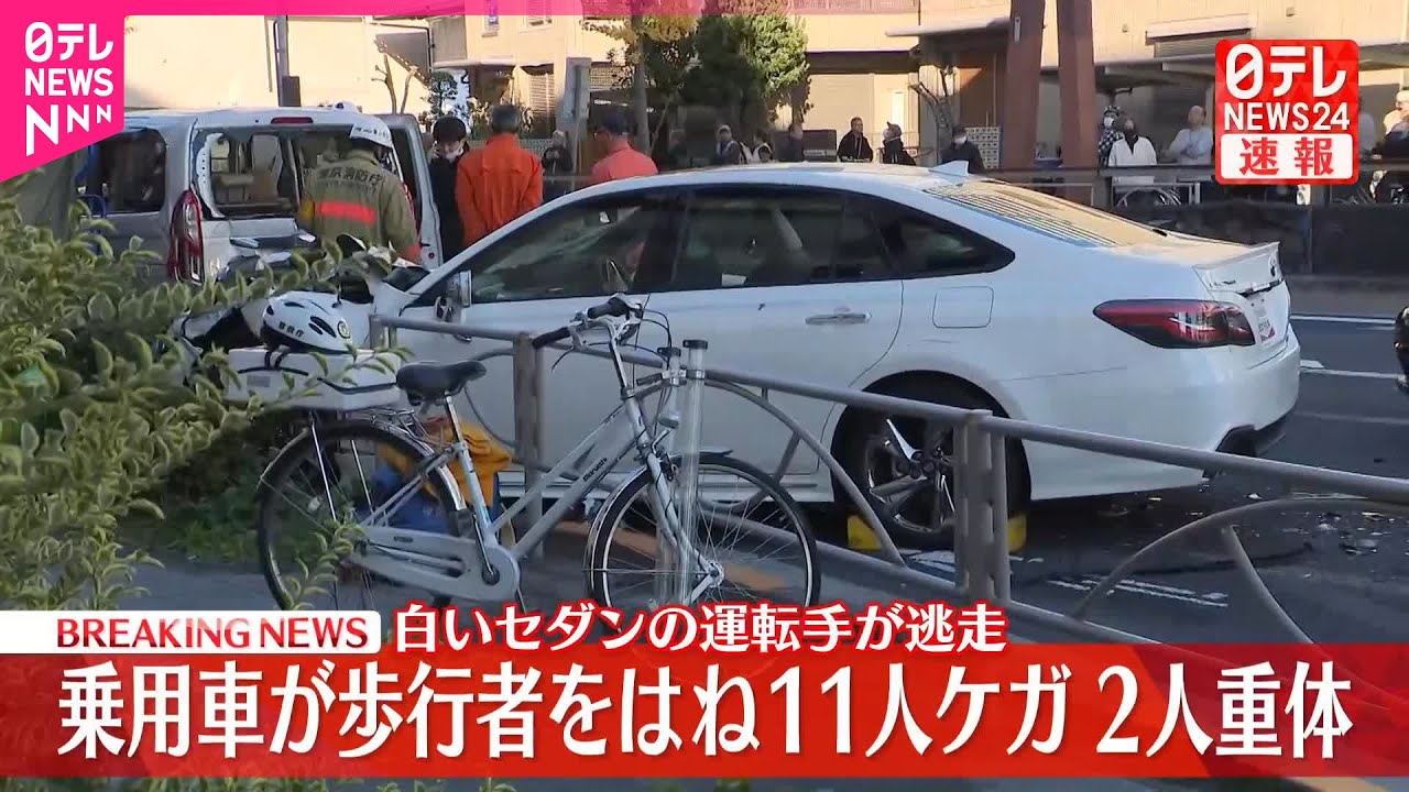 警視庁によりますと、24日午後0時半ごろ、東京・足立区梅島(うめじま)の国道4号で乗用車が歩行者をはね、ケガ人が11人出ています。このうち2人は意識不明の重体だということです。また、現場の映像によると、自動車も複数台巻き込まれている様子がうかがえました。